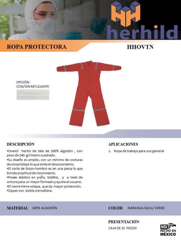Uniforme de una sola pieza 100% algodón con o sin reflejantes.