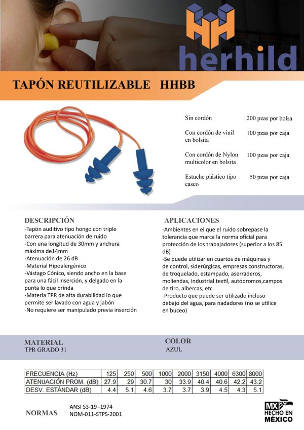 Tapón reutilizable con triple barrera y atenuación NRR26
